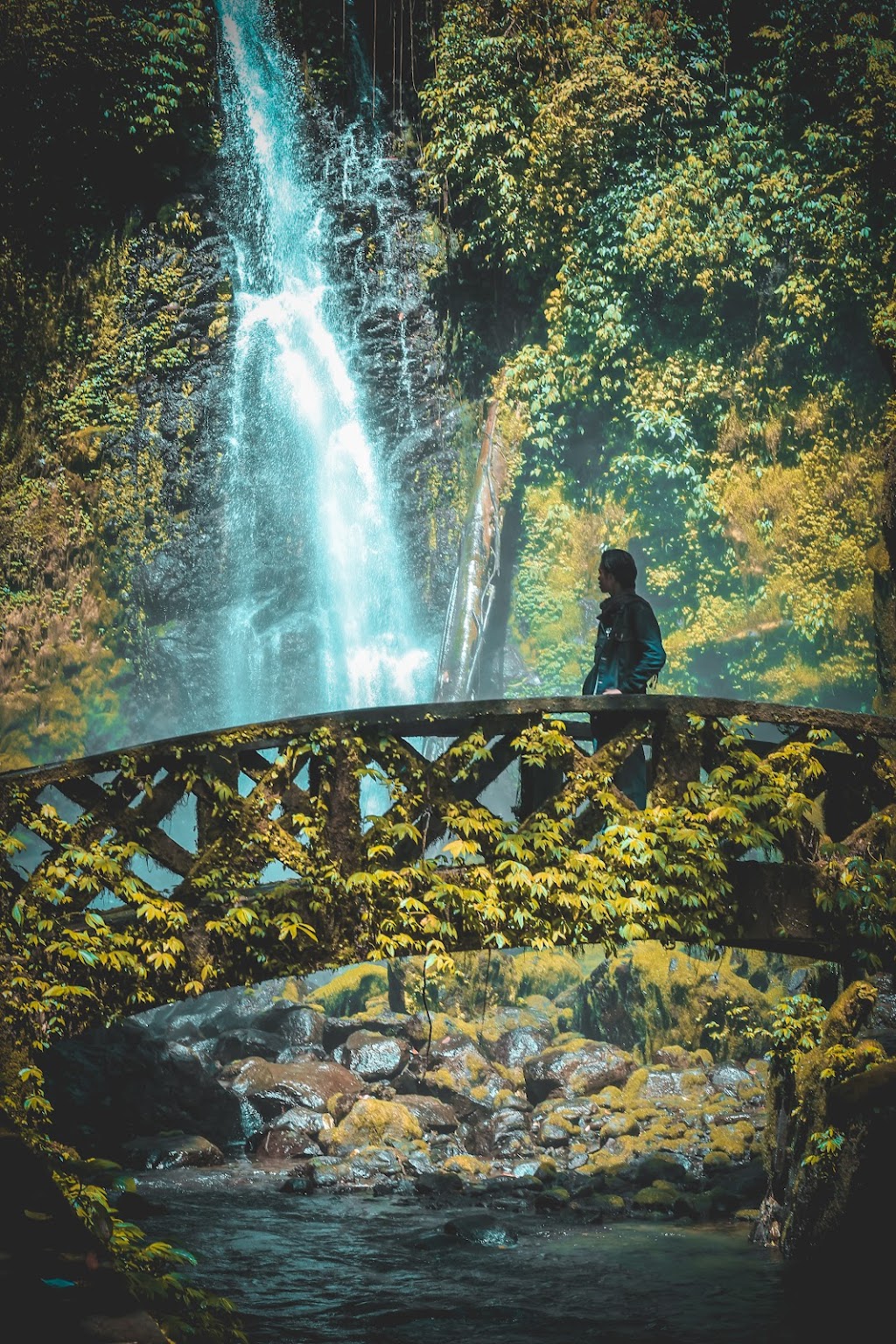 • Berfoto dengan latar belakang air terjun yang indah.